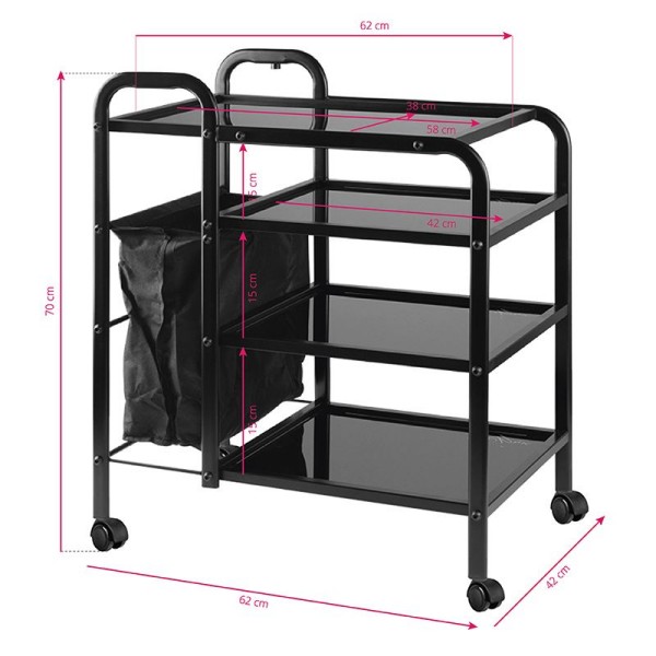 A functional metal and glass storage trolley on rubber wheels with four glass shelves . An additional advantage is the included bag for dirty towels, tapes, etc. It has a lamp holder.